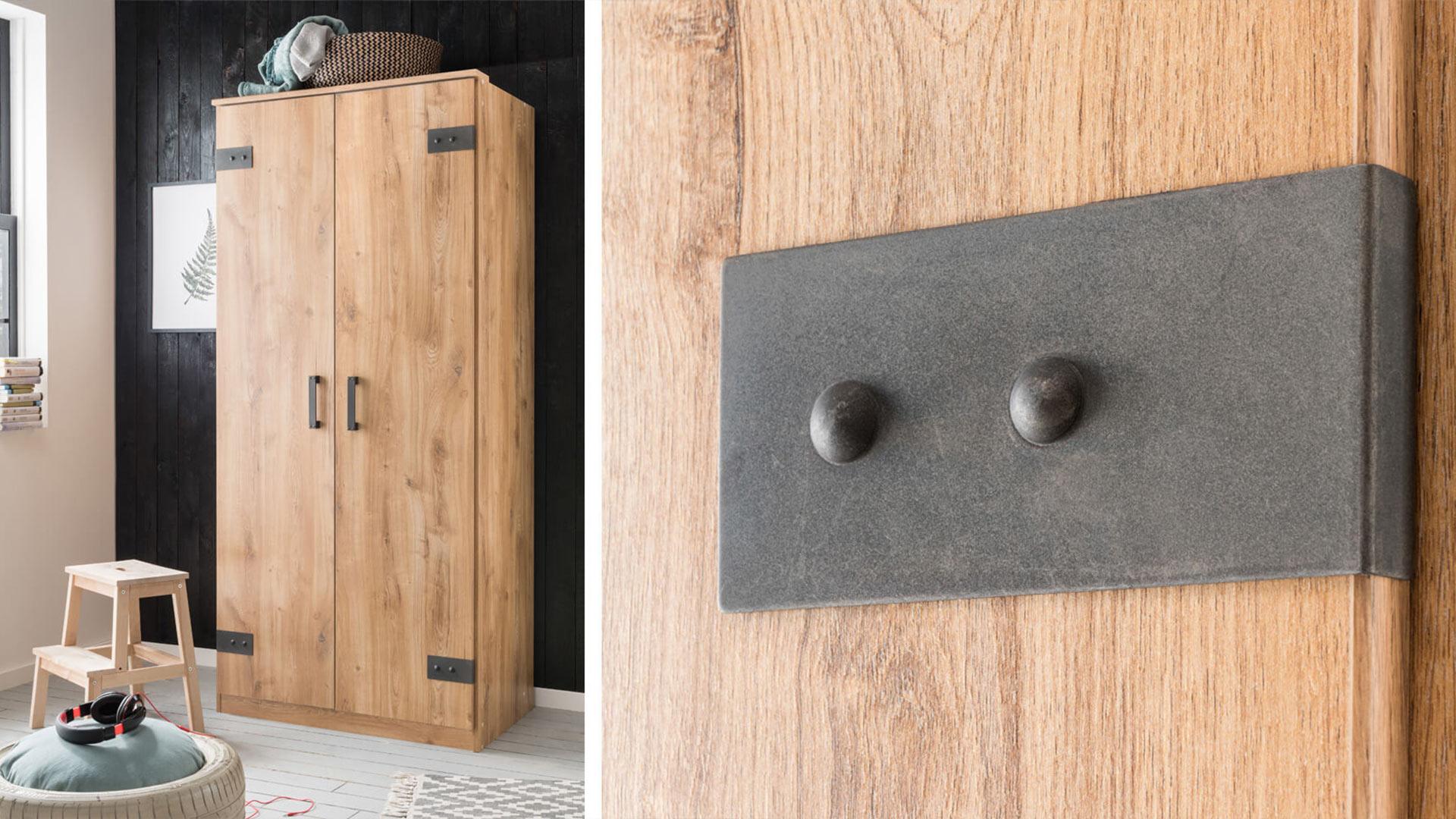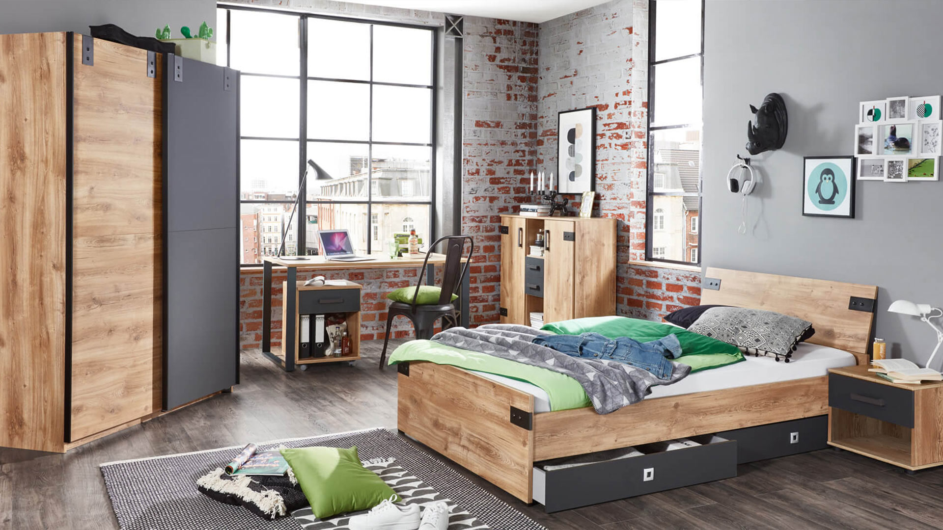 Liverpool is not only known as the musical home of the Beatles, but also as the name giver for your future teenager's room in the hip industrial look. Designed for hanging out, jamming and listening to music, this room is guaranteed to not be boring thanks to the cool loft feeling. Made of robust plank oak replica and with numerous graphite accents, highlights such as robust iron fittings on the wardrobe and bed, solid iron feet on the desk as well as two-coloured bed drawers, versatile roller container and wardrobes with extra storage space set the tone in the LIVERPOOL youth room.