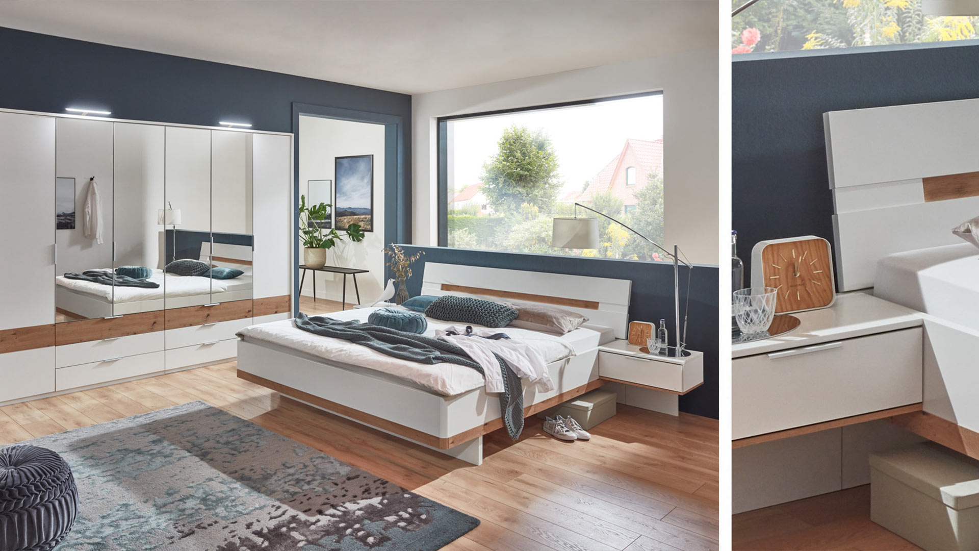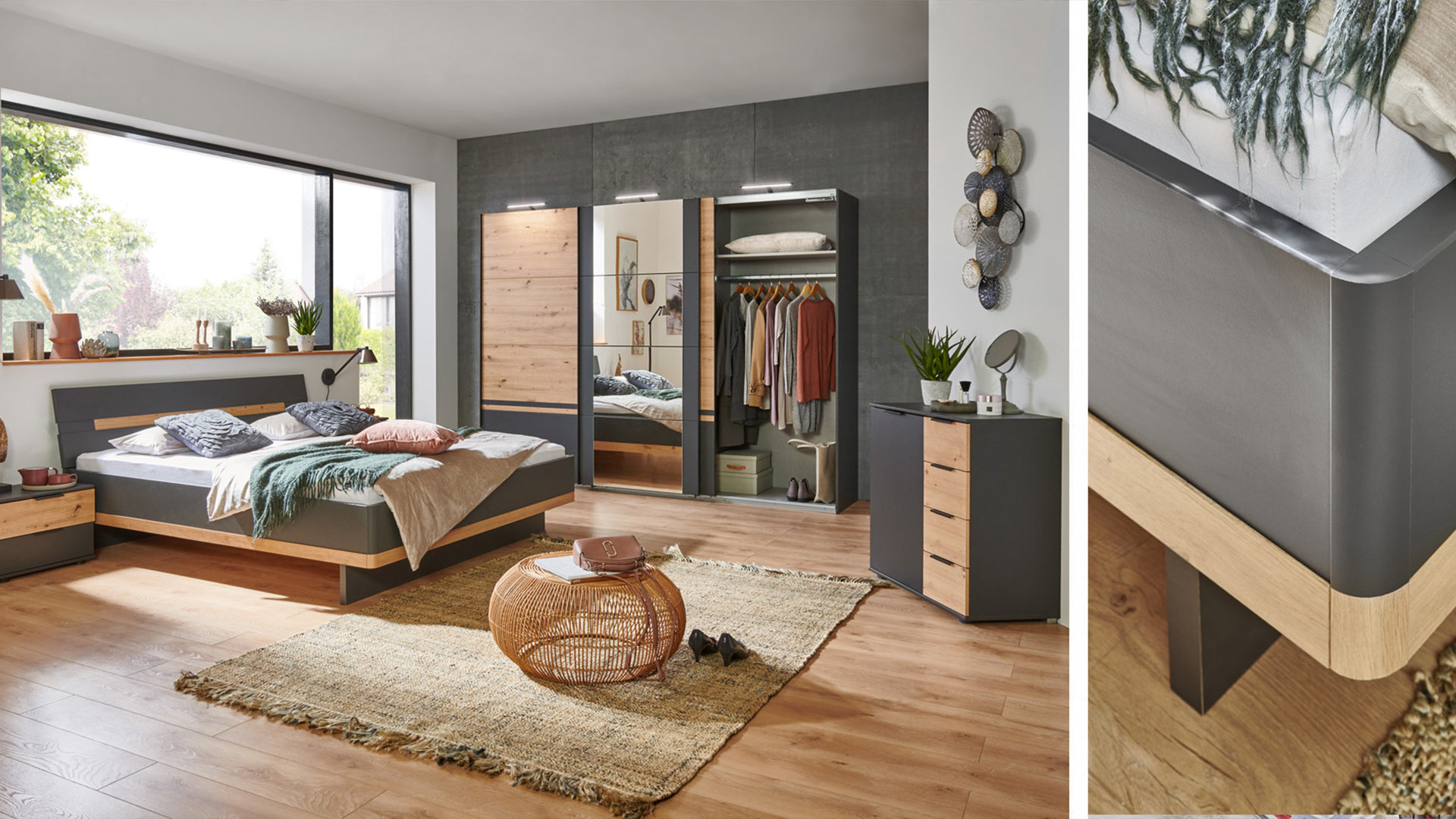 Just as the small British enclave with its famous rock combines various influences from a turbulent history, so too does the GIBRALTAR comfort bedroom shine with its different aspects. In terms of colour, you can choose between radiant white or muted graphite - fine and flat accents in a warm wood look give both versions a certain elegance. Maybe you've just come from a shopping trip to the southern tip of the Iberian peninsula. In that case, the hinge-door wardrobes with their practical drawers will provide adequate space for your new acquisitions. Or you can stow them away in one of the spacious compartments of the three-door sliding-door wardrobe. To admire your wardrobe - before you set off on your next adventure - the generous mirrored doors offer you the best opportunities.