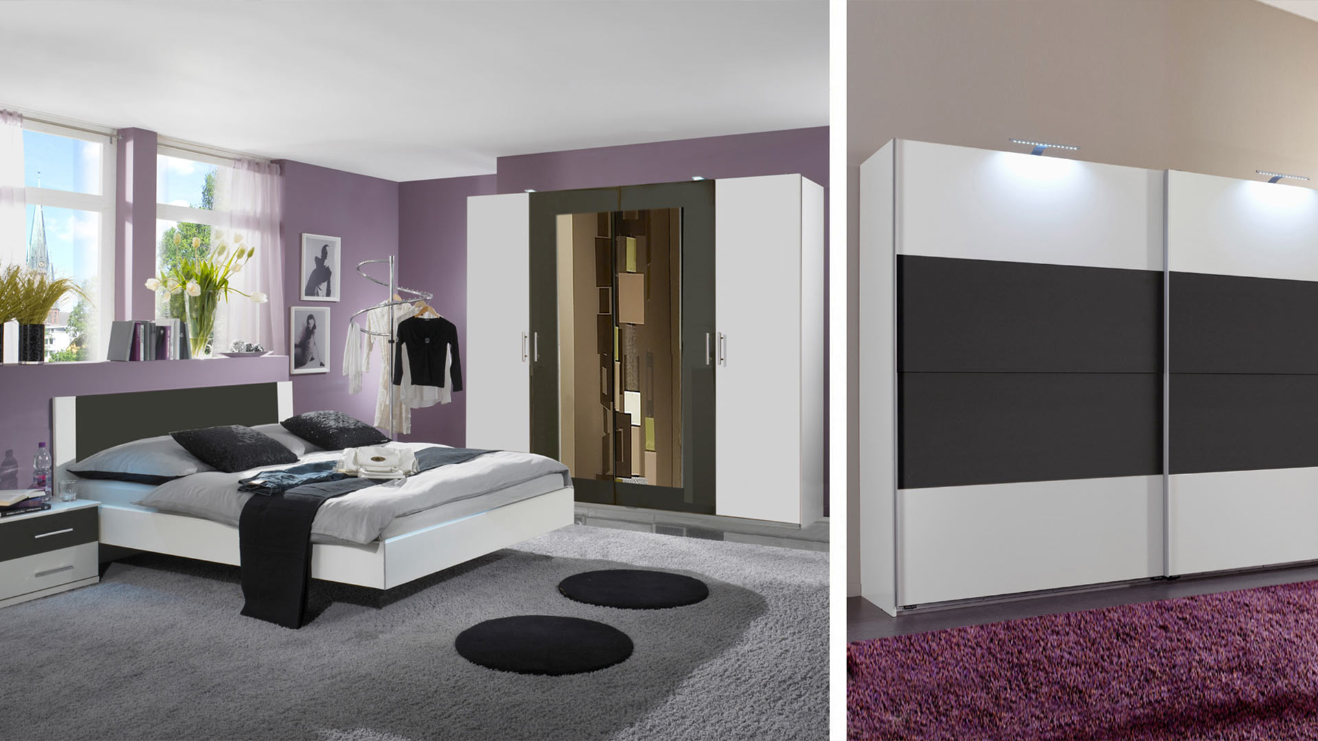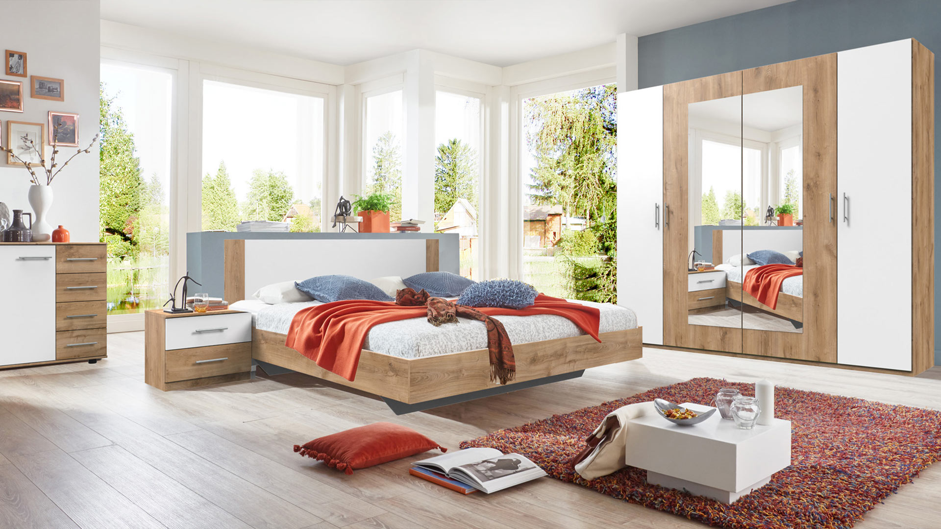 NORA is all about colour blocking. Two rustic wood tones with white or graphite-coloured offsets and a contrasting combination of plain white with accents in strong graphite attract all eyes. On the hinge-door wardrobe with two mirrored doors, the entire mirrored surface appears to be framed with bold colour stripes, while the sliding-door wardrobe makes a statement with its large-scale colour stripe.
