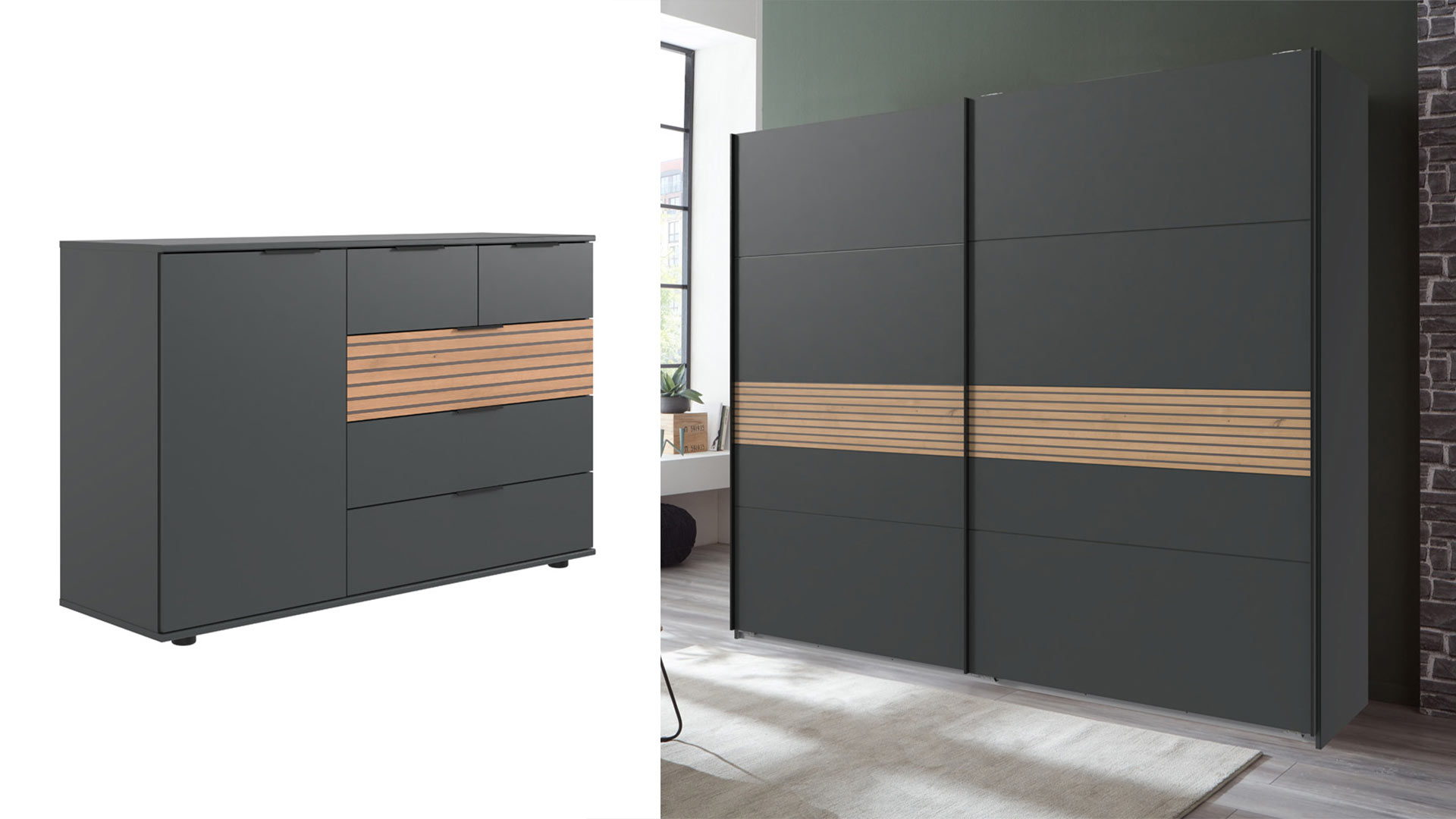 Just as the international harbour connects people from all over the world, the ROTTERDAM bedroom creates the perfect harmony of style and cosiness. In keeping with the exciting contrast between impressive, modern architecture and spacious, green parks, the cool elegance of graphite meets cosy Artisan oak reproduction with an acoustic lamella look.