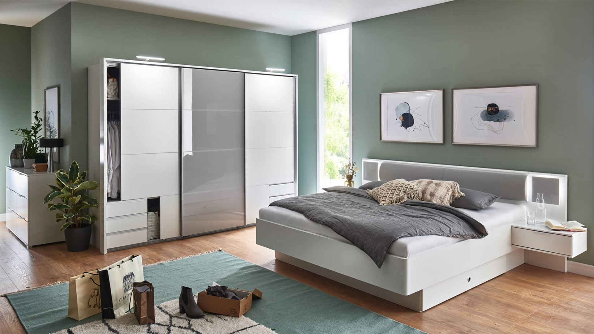 The comfortable futon bed is equipped with an upholstered headboard, two illuminated LED panels and two floating bedside cabinets and is ideal for creating feathery dreams. The spacious floating door wardrobes in two different widths will enchant you with combined fronts in a noble wood and glass look and can be fitted with additional drawers, a passe-partout frame and LED lights on request. Combined with drawer or combination chests of drawers, a rotating hanging mirror and additional bed drawers, the comfort bedroom creates a relaxed retreat where you can enjoy your well-earned siesta to the fullest.