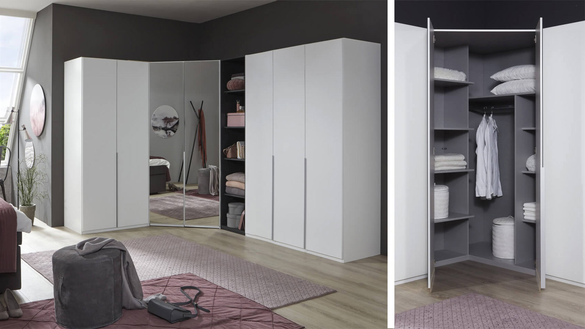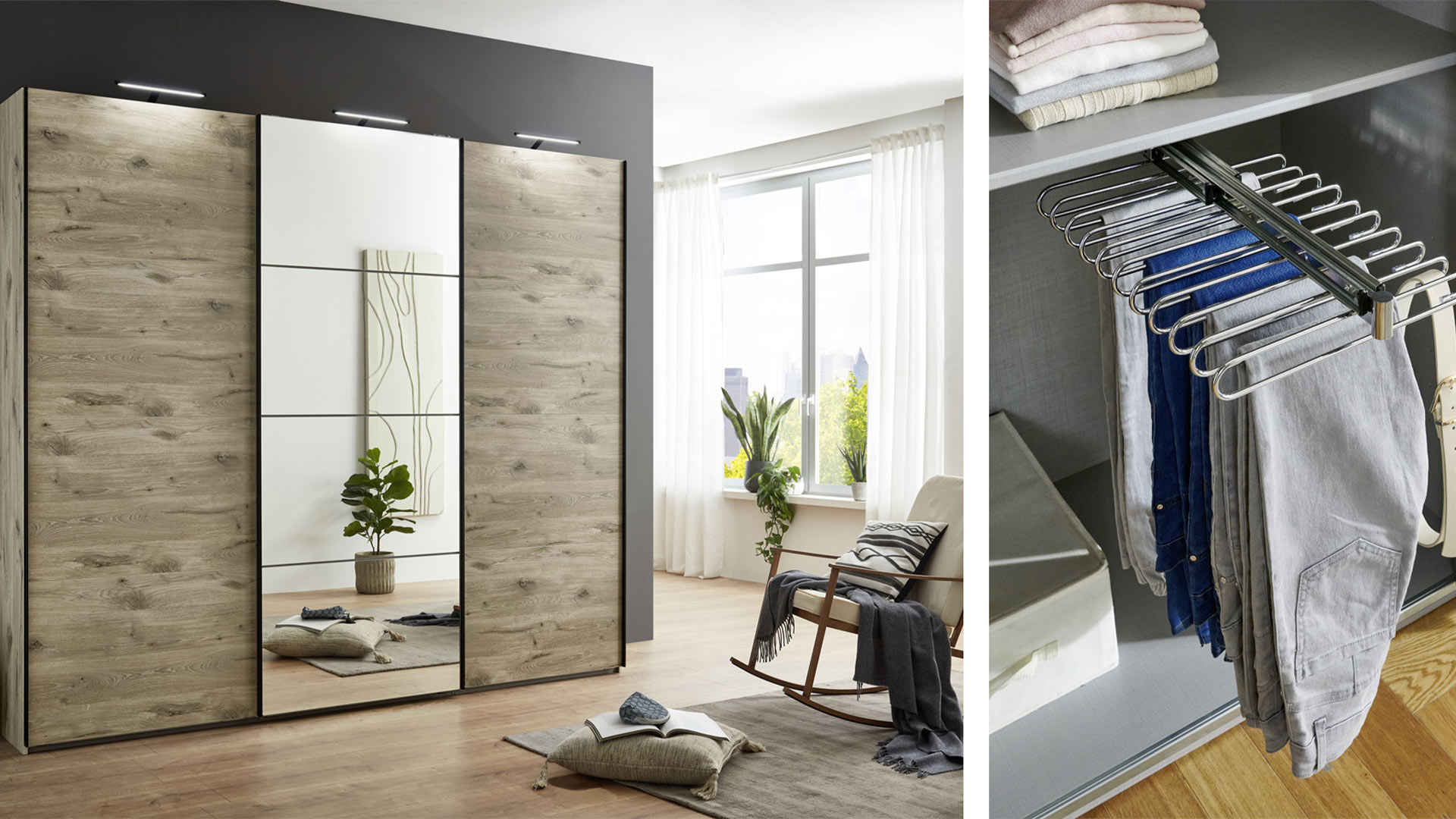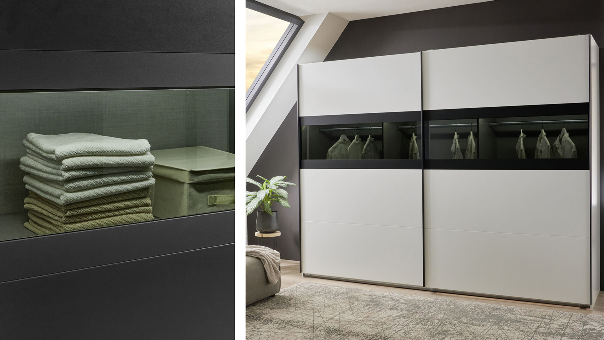 You can also put together the matching accessories for your favourite wardrobe from the EASY PLUS series according to your personal preferences in terms of function, comfort and the exterior and interior lighting of the body and doors: Variously dimensioned add-on elements such as floor-level mirror fronts, clever corner wardrobe solutions and variable shelves in combination with additional drawers, linen dividers, shelves and clothes racks open up almost unlimited design possibilities for your EASY PLUS wardrobe, which turns any room into a walk-in dressing room to fall in love with.