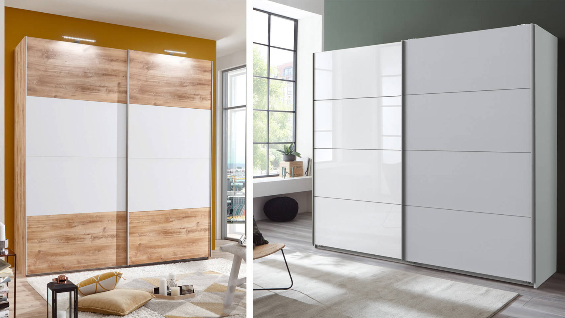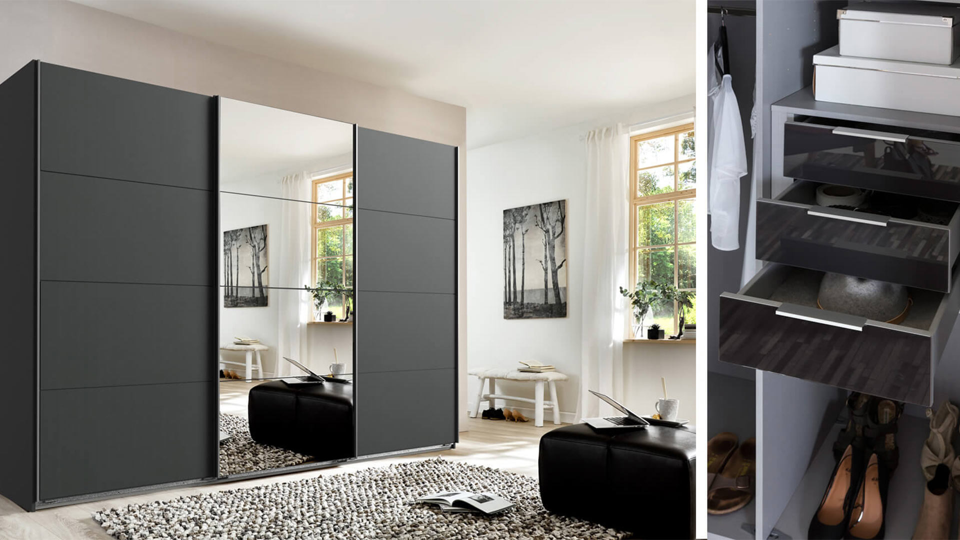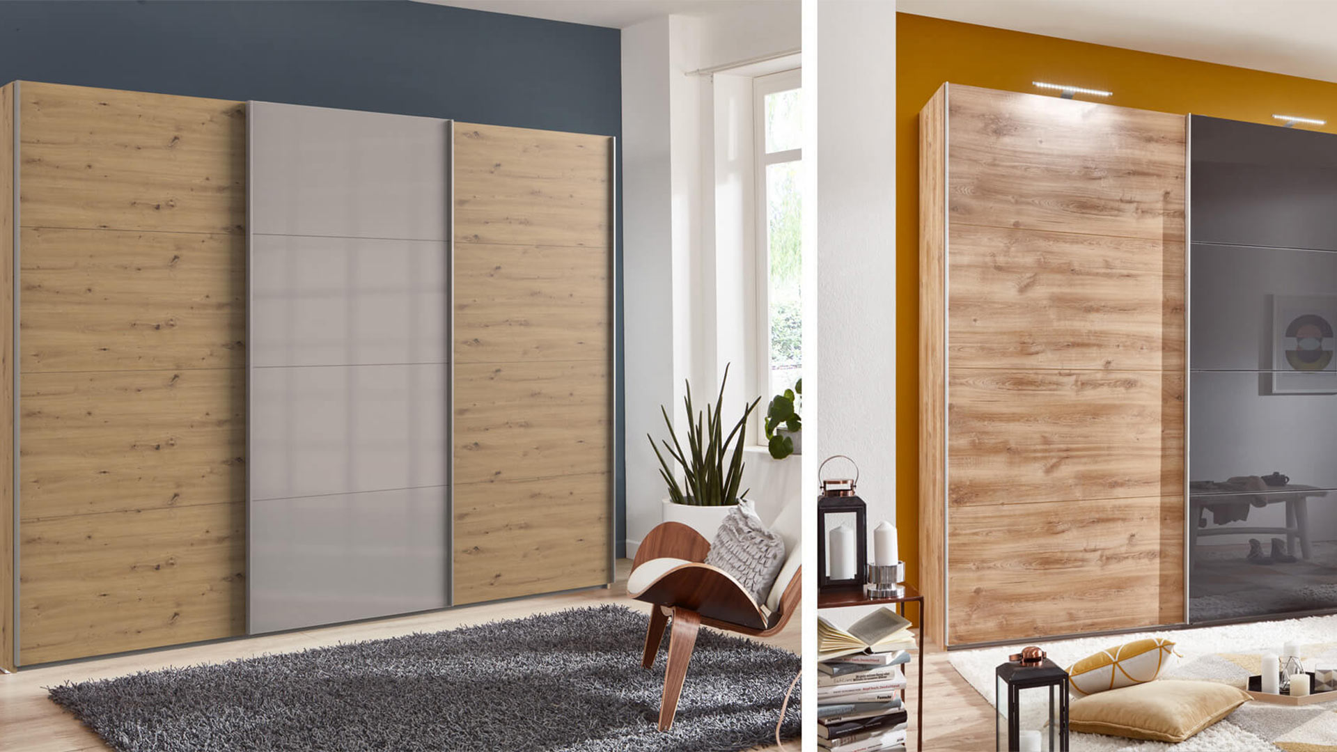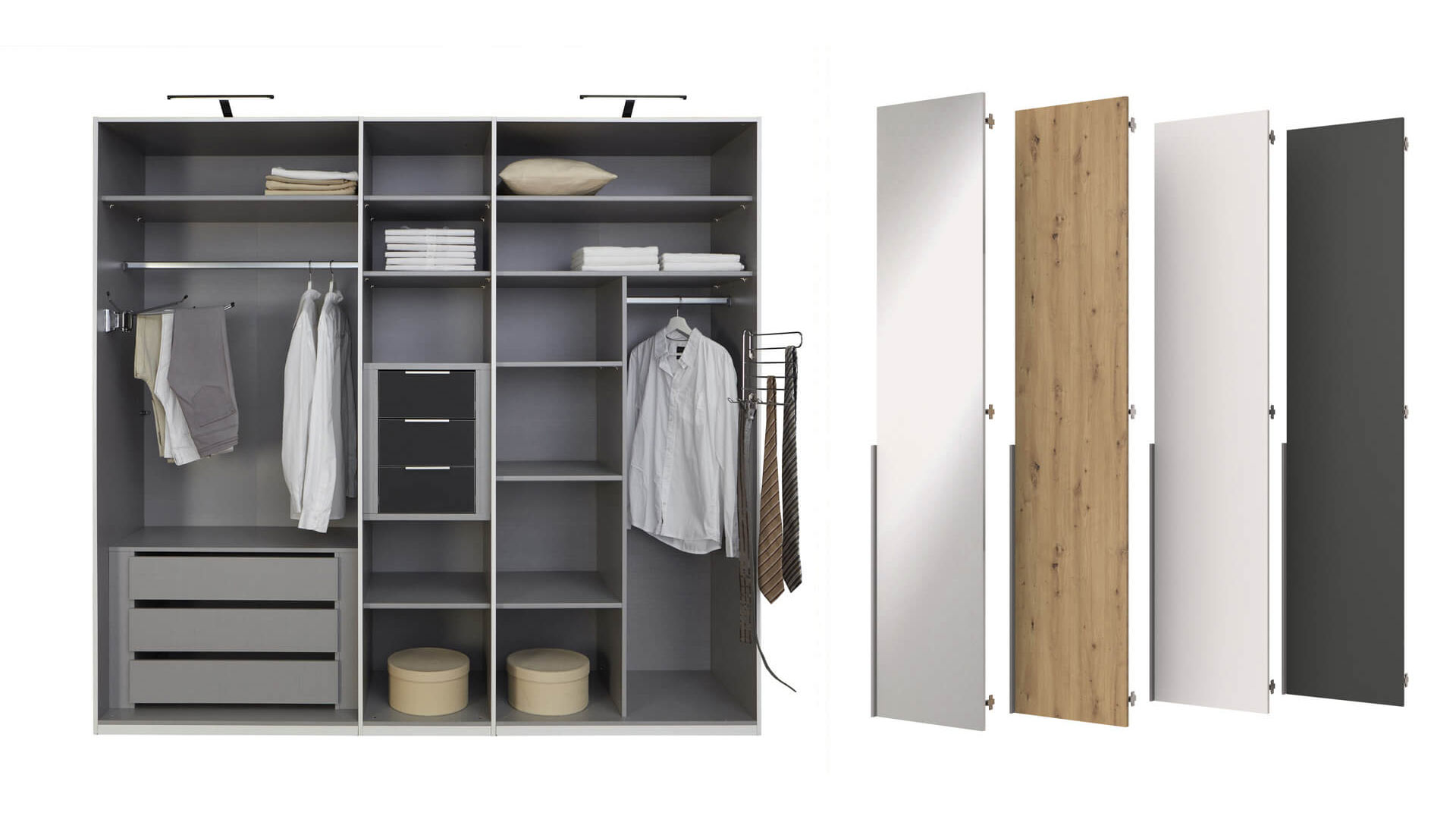 With the versatile EASY PLUS range, you can complete your perfectly coordinated furniture selection in terms of carcass, doors and accessories. Available in two different heights and five widths, you can of course determine the final size of your sliding door wardrobe yourself. Thanks to a total of six modern carcass colours such as white and graphite as well as stylish wood reproductions in oak, plank oak, mud oak or artisan oak, you simply select two doors of the same width as your base partner and match them to your desired front variant. You can combine them in any way you like, just position the four panels of your front doors according to your visual ideas and choose between high-quality coloured glass or floor-to-ceiling mirror fronts.