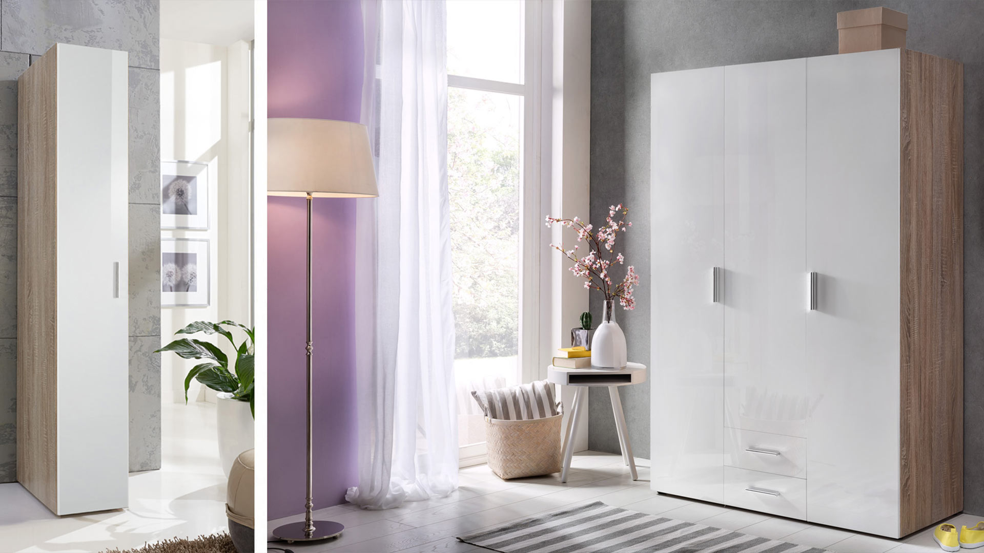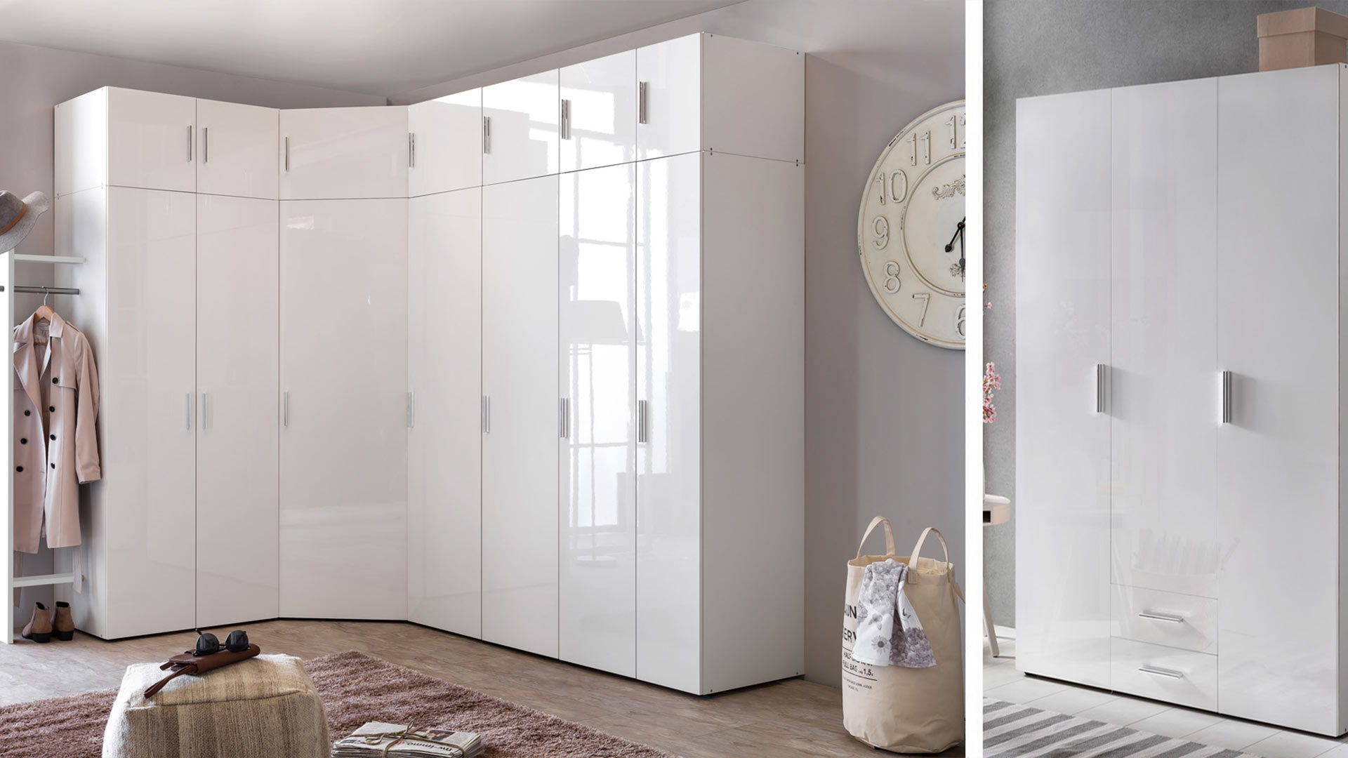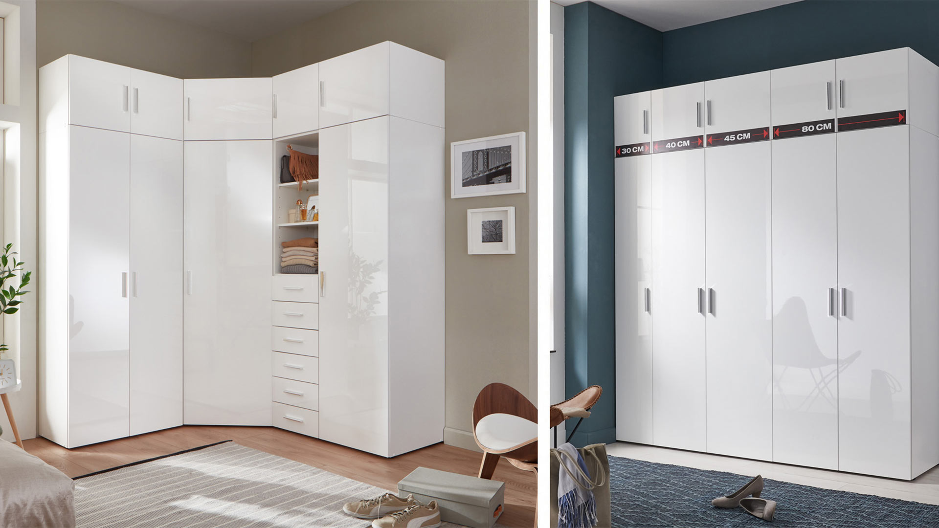 Still not enough? Then treat yourself to even more storage space - neat and tidy with the three drawer chests. Cupboard system for every room with MALTA you'll find the perfect solution for the whole house. You can create your perfect hallway furnishings or wardrobe from wardrobes with a slim depth of 40 cm. Or you can use them in rooms where space is rather limited. You can even combine deep and less deep wardrobes with the corner wardrobe. The 54 deep wardrobes can be wonderfully combined to create your own individual wardrobe. With additional shelves, linen dividers and drawer inserts, you can also adapt the interior to your own requirements. The MALTA wardrobes and chests of drawers are available with a white carcass or in oak woodgrain imitation. With both versions, the high-gloss white lacquer front sets brilliant accents everywhere. Storage space with a sophisticated look.
