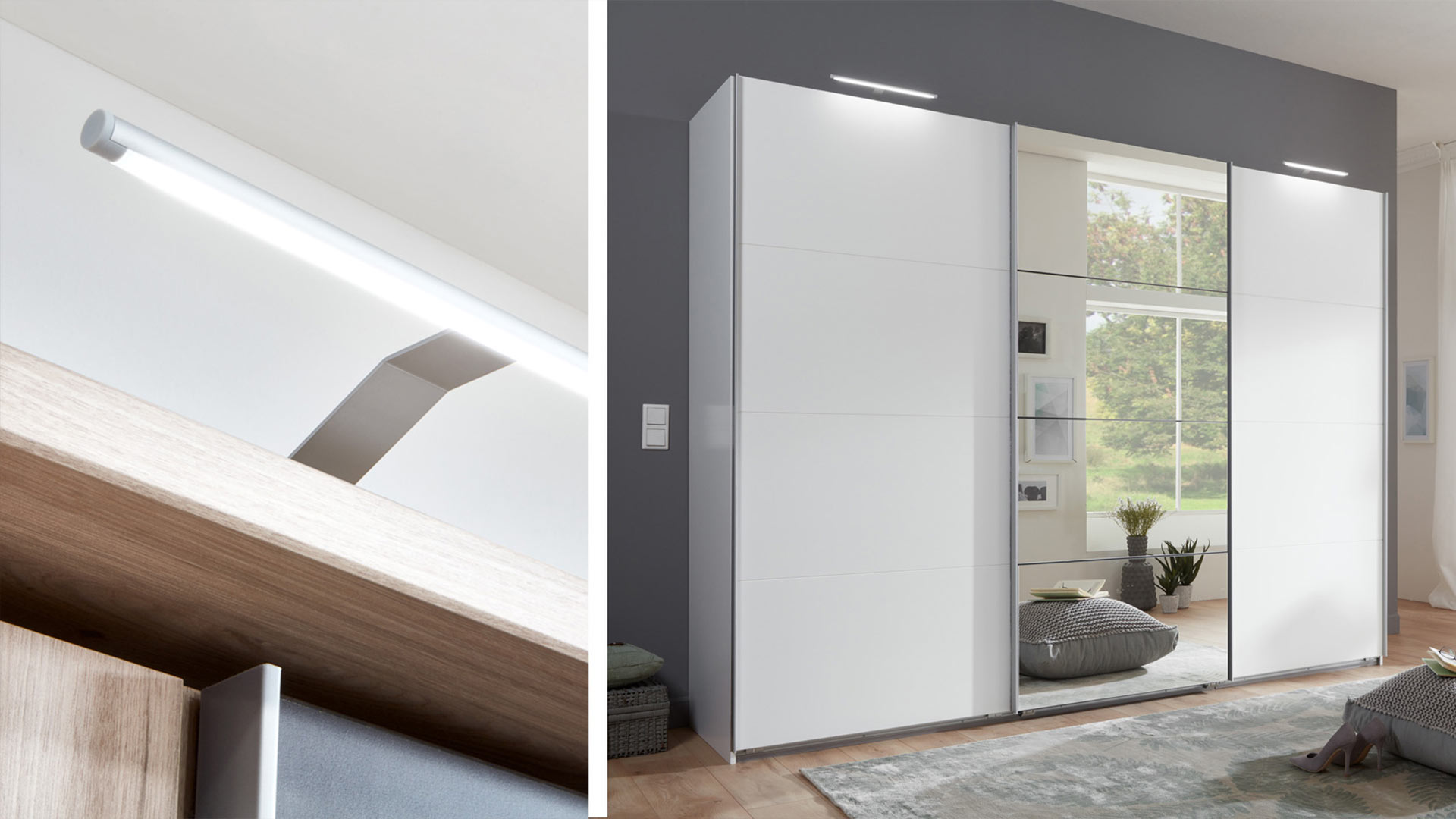 Inside, the basic equipment consists of clothes rods and shelves. Depending on your needs, you can now equip the wardrobe further and give your treasures the environment they deserve. Add more shelves and clothes rails, subdivide the storage space with drawer and linen inserts and place practical trouser holders or belt and tie holders for perfect access to your wardrobe. For even more comfort, we have the whisper-quiet self-closing kits for sliding doors - then things will run "like clockwork" here, too. And you can also further enhance the exterior of your simple sliding-door wardrobe: with a stylish passe-partout frame or with radiant LED top lights - or of course with both, just the way you like it.