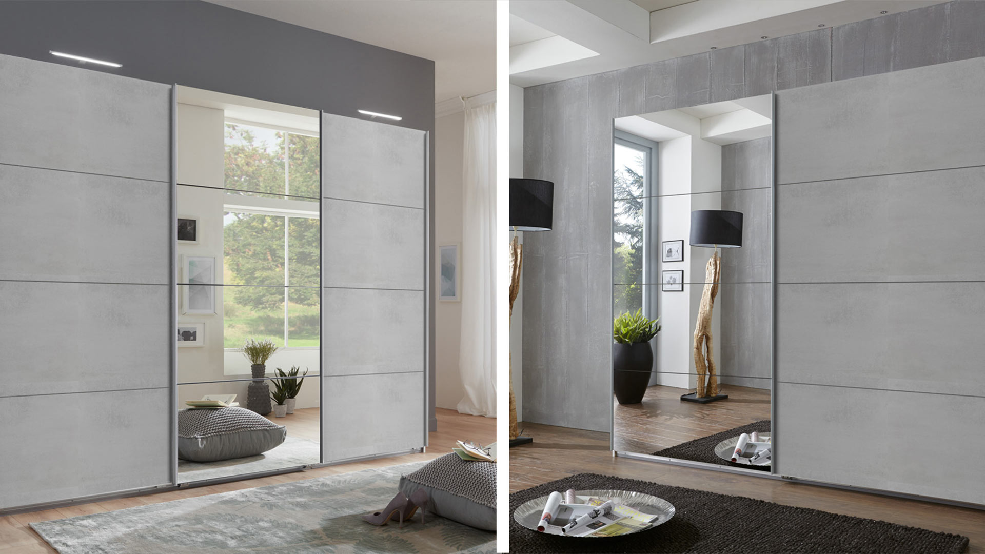 Attention, here comes Ernie. Best buddy for your own life. Open for all directions. Which style do you live? Do you deliberately get Ernie in neutral white, so that you can otherwise let off steam completely? Or does a wardrobe in a light wood tone suit you best? Maybe the cheeky combination of white with concrete-look fronts is just right for you? In any case, you get a solid sliding-door wardrobe with a generous, floor-to-ceiling mirrored door as the basis.