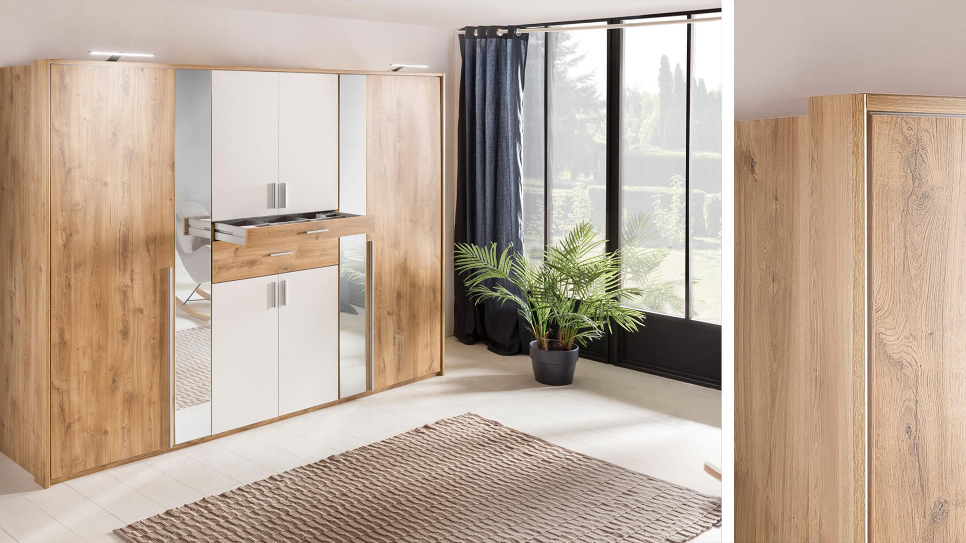 Available in four chic decors from a plank oak replica with middle doors in white, a hickory oak replica with middle doors in raw steel, to the white version with drawers and passepartout frames in carbon oak or sawn oak replicas, you'll find a style to suit every taste. The complementary bedside cabinets in the ODESSA range, with drawers in the set-off colour, are ideal for harmoniously completing your bedroom furnishings.
