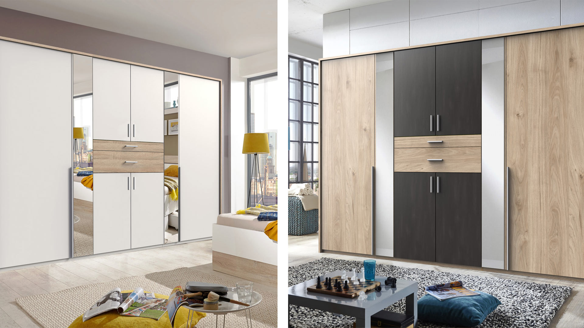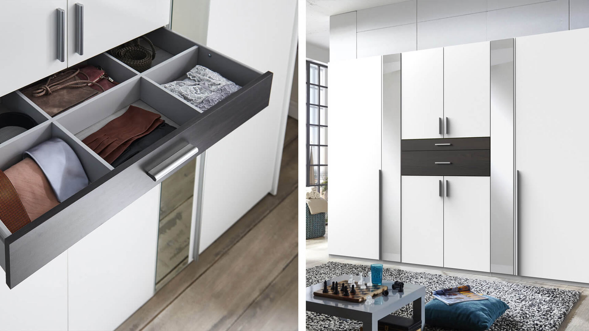 With the ODESSA hinge-door wardrobe range you finally have a styling partner at eye level. The graphic interplay of the centrally positioned drawers, which provide plenty of space for belts, ties and socks, the divided wardrobe doors including side mirror set-backs and the modern design of the wardrobe handles make the wardrobes of the ODESSA series an eye-catcher in every bedroom and dressing room. Thanks to the well thought-out division of the wardrobe's interior, including the separate accessory compartment, you always have a clear overview even in the greatest chaos and can put together your outfits for school, university or work in no time at all!