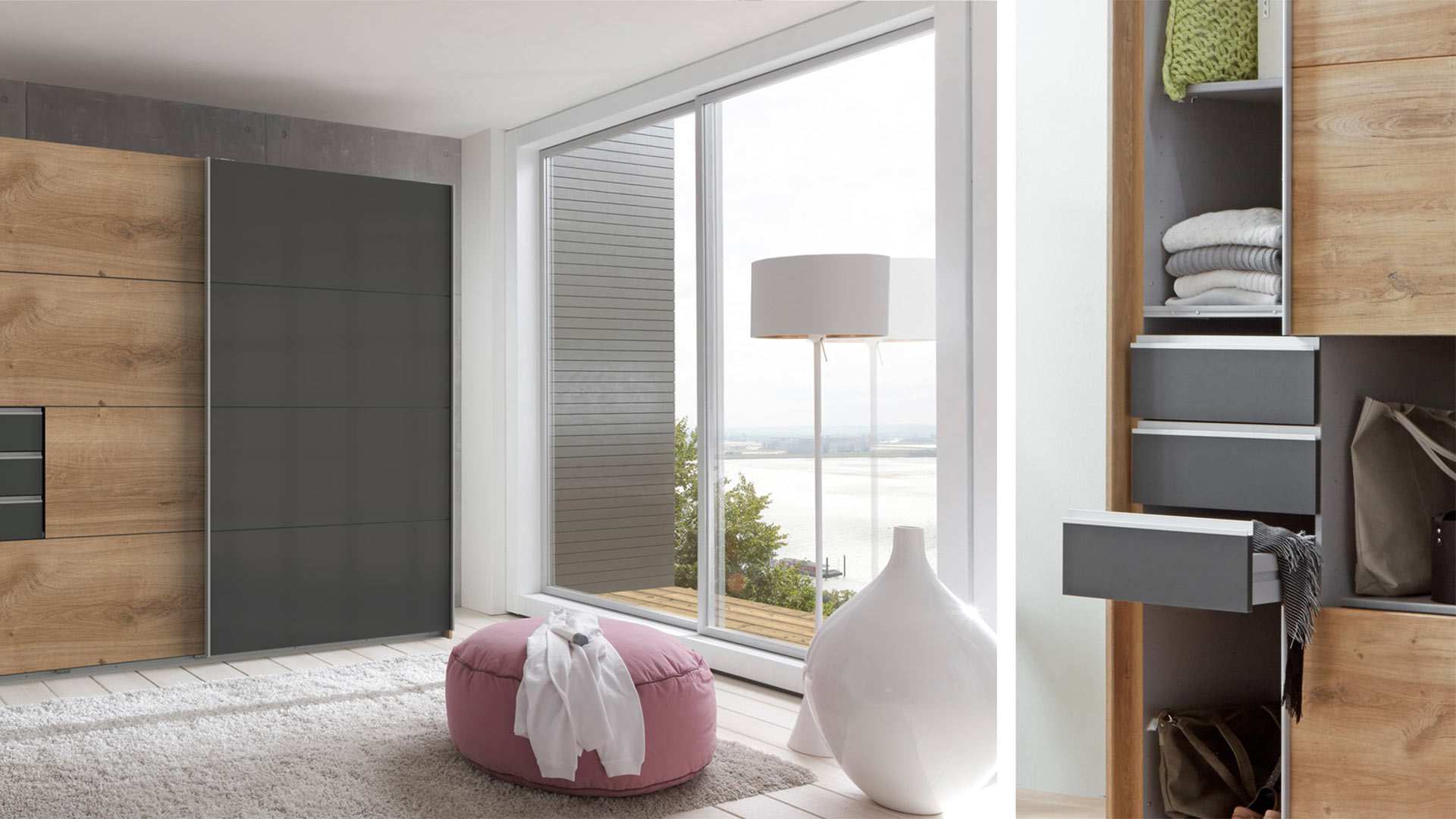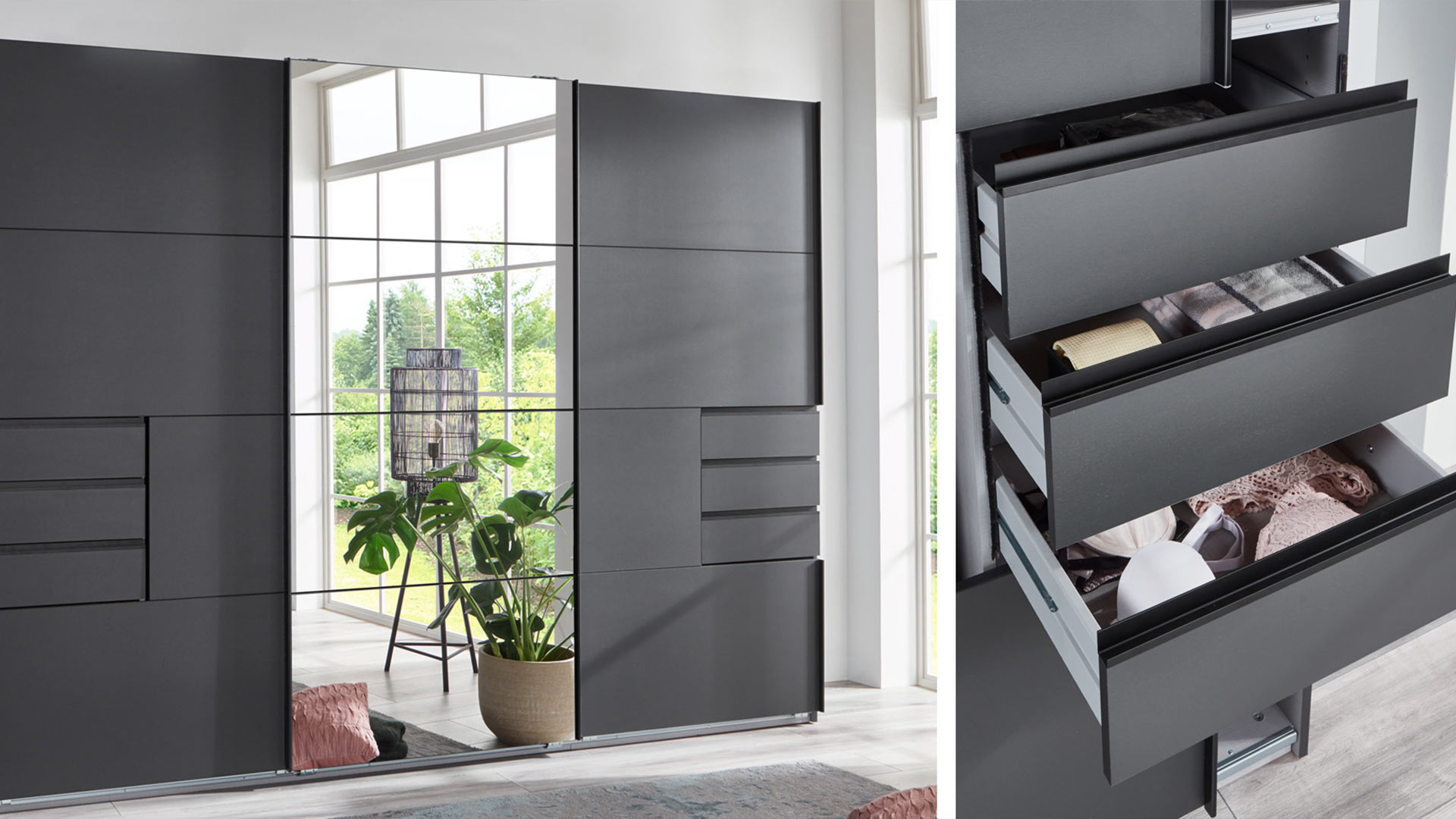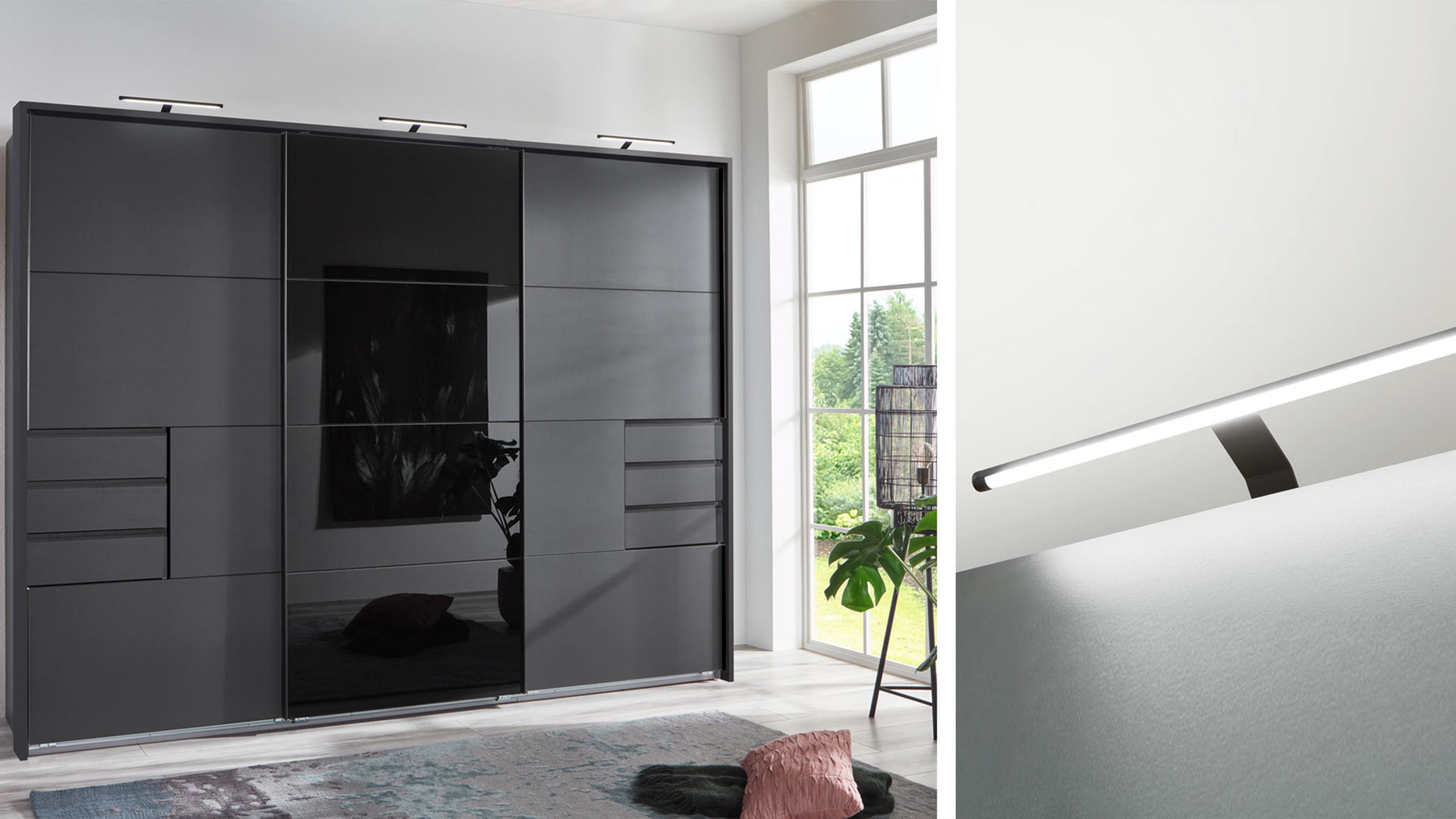 The main attraction here are the drawers integrated into the front at a conveniently accessible and clear height, which are recessed in the surfaces of the sliding doors. So you can open the drawers even when the doors are closed and easily access your beloved little designer pieces. Depending on your requirements and the space you need, you can choose a 225 cm wide wardrobe with 2 doors and 3 drawers in the left-hand panel. Or you can choose a wardrobe 270 cm wide with 3 sliding doors and 3 drawers on each outer door. There's plenty of storage space inside. In compartments of different widths and heights and on sturdy clothes rails, you can accommodate every fashion trend in style. If you wish, you can decorate your SAIGON wardrobe with a matching passe-partout frame and - for even more sparkle - with a radiant LED top light.