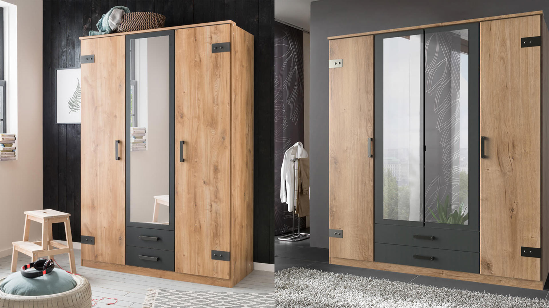 Industrial chic meets a natural look: If you like your interior design to be both rustic and urban, then the CORK hinge-door wardrobe range is the perfect choice. The graphite-coloured door fittings, cabinet handles and trims are reminiscent of solid metal and, in combination with the fronts made of plank oak repilca, give your CORK revolving door cabinet the ultimate kick. The sturdy wardrobes with the practical revolving doors are available in two different widths, including drawers and provided with one or two mirrors.