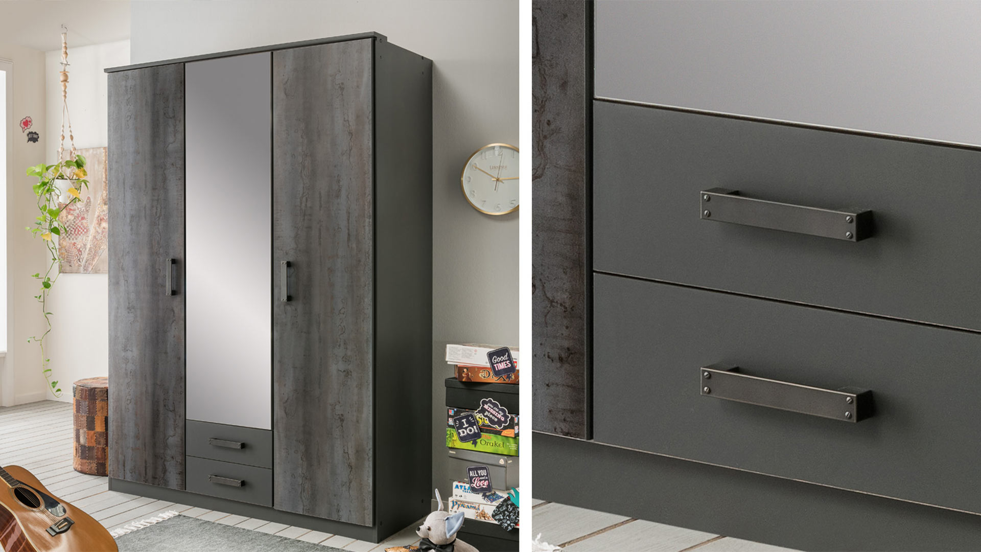 Here comes a real power package! The DUISBURG hinge-door wardrobe immediately catches the eye with its practical features and strong look. The hinged doors with their eye-catching steel look are set off perfectly by the strong graphite of the carcase and drawers. To make sure you can always check your styling, the wardrobes have one or two mirrored doors, depending on the width. The top of the wardrobe is finished off with a simple cornice on which you can place an extra wardrobe light. So you really have everything in view. With widths of 90, 135 and 180 cm, it is a fine, small representative of its kind and looks slim.