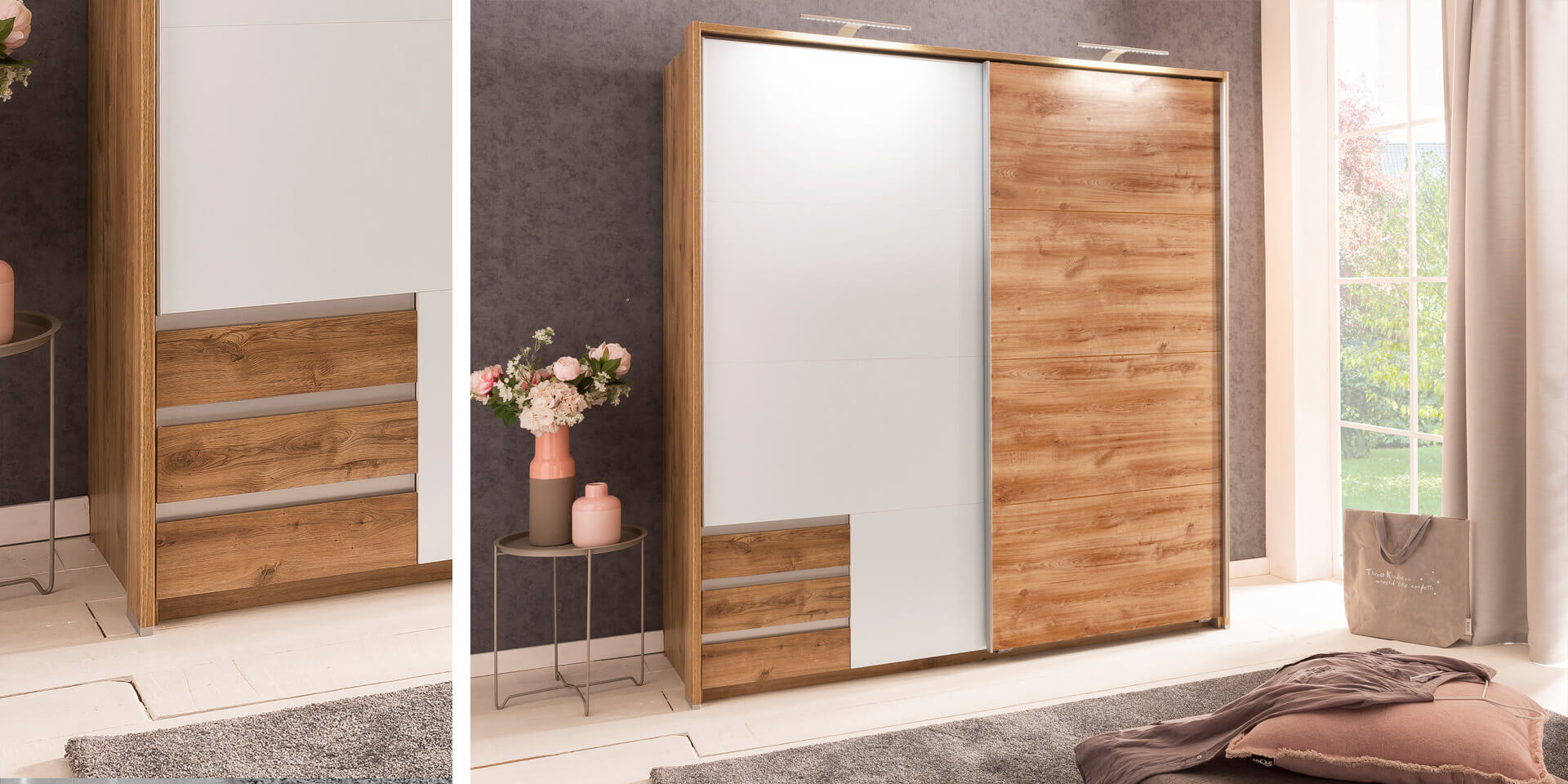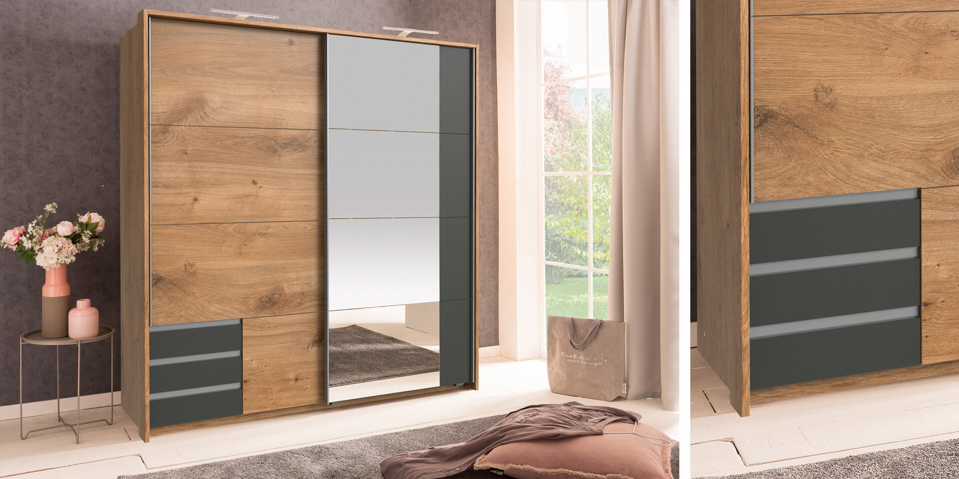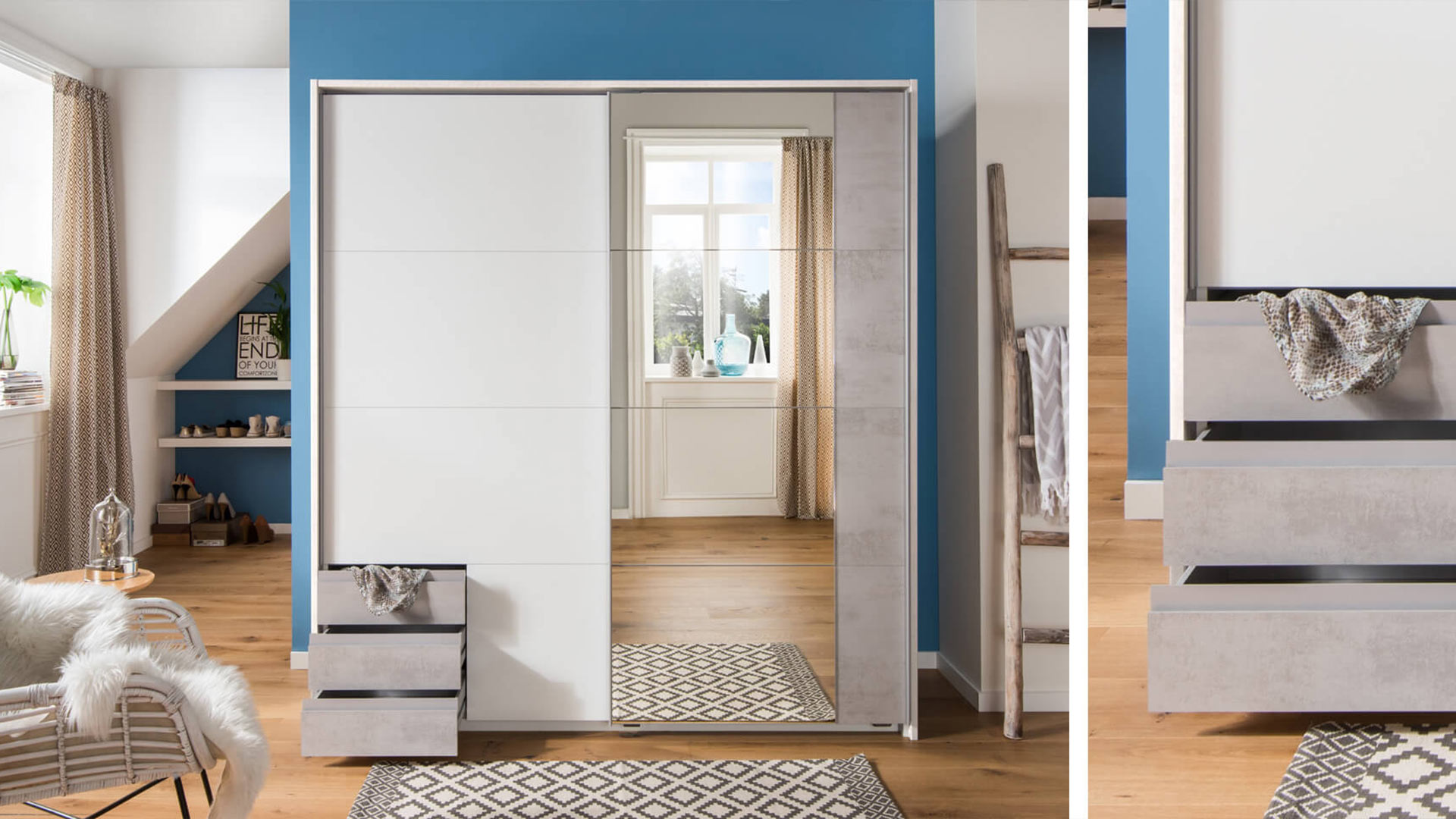 The EMDEN sliding door wardrobe is available in four different decors, including a solid concrete and rustic plank oak replica, so that you always have a handful of water under the keel, even in the most fashionable clothing storm. Ahoy!