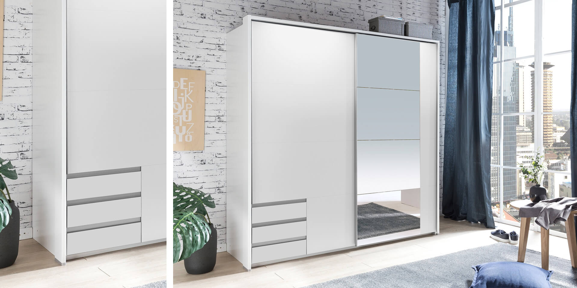 High up north, located in the heart of East Frisia, lies the city of Emden with its horizon stretching for miles. The sliding door wardrobe in our EMDEN furniture range is just as uncomplicated and down-to-earth as the flat countryside. At first glance, simple and clear in its visual appearance, the EMDEN sliding door wardrobe, offers a lot of depth, behind the unadorned façade. With two doors and floor-length mirrors , a left-sided drawer cube and an accentuated passe-partout frame, these sophisticated details of the sliding door wardrobe already give you a small taste of what it is made of: several shelves, three spacious drawers and an additional clothes rail allow you to store your clothes neatly and remove your favourite things with just a single action.