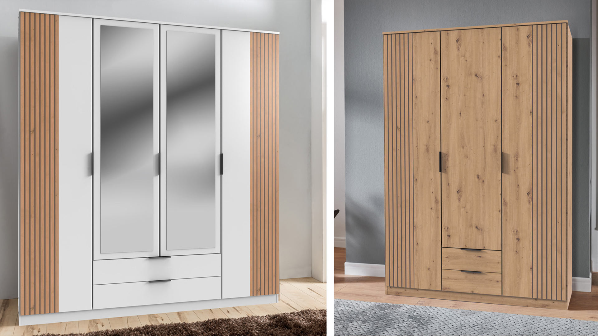 LÜBECK adapts flexibly to your style. Are you a fan of the simple look? Then a wardrobe in white or graphite is the right choice. If you want to bring a touch of nature into your room, choose it in in Artisan oak reproduction. Accents in stylish acoustic lamella reproduction characterise all colour colour variants. Its narrow cornice moulding gives the wardrobe a special touch and makes it a highlight in your room.