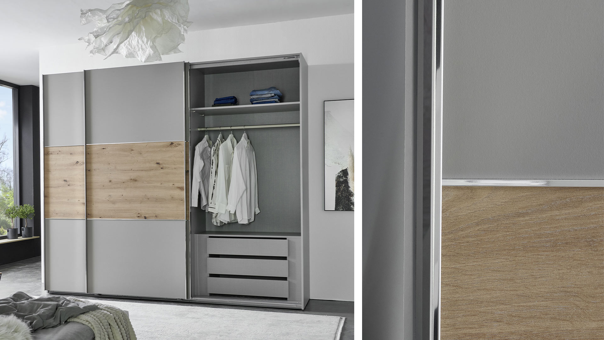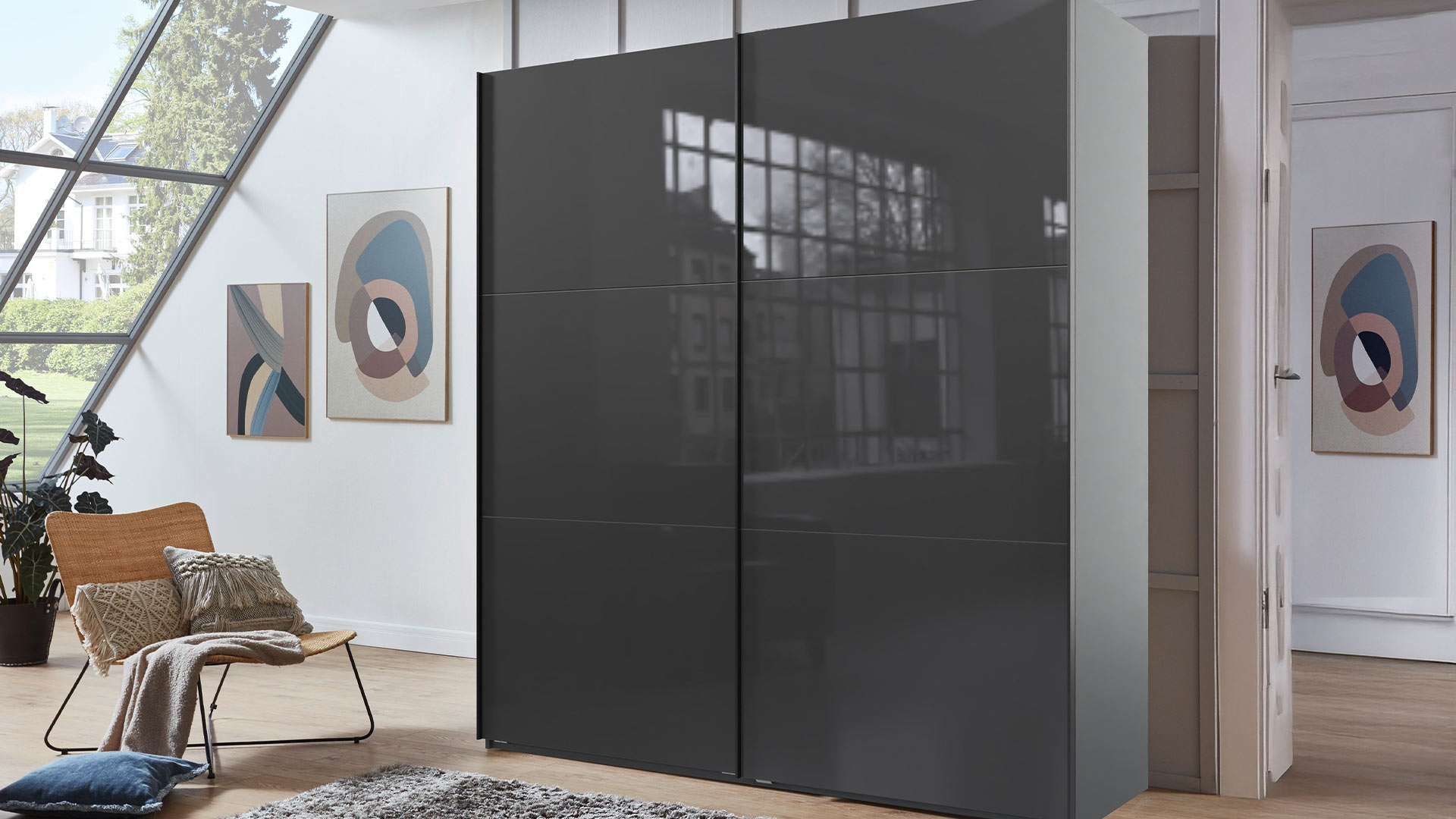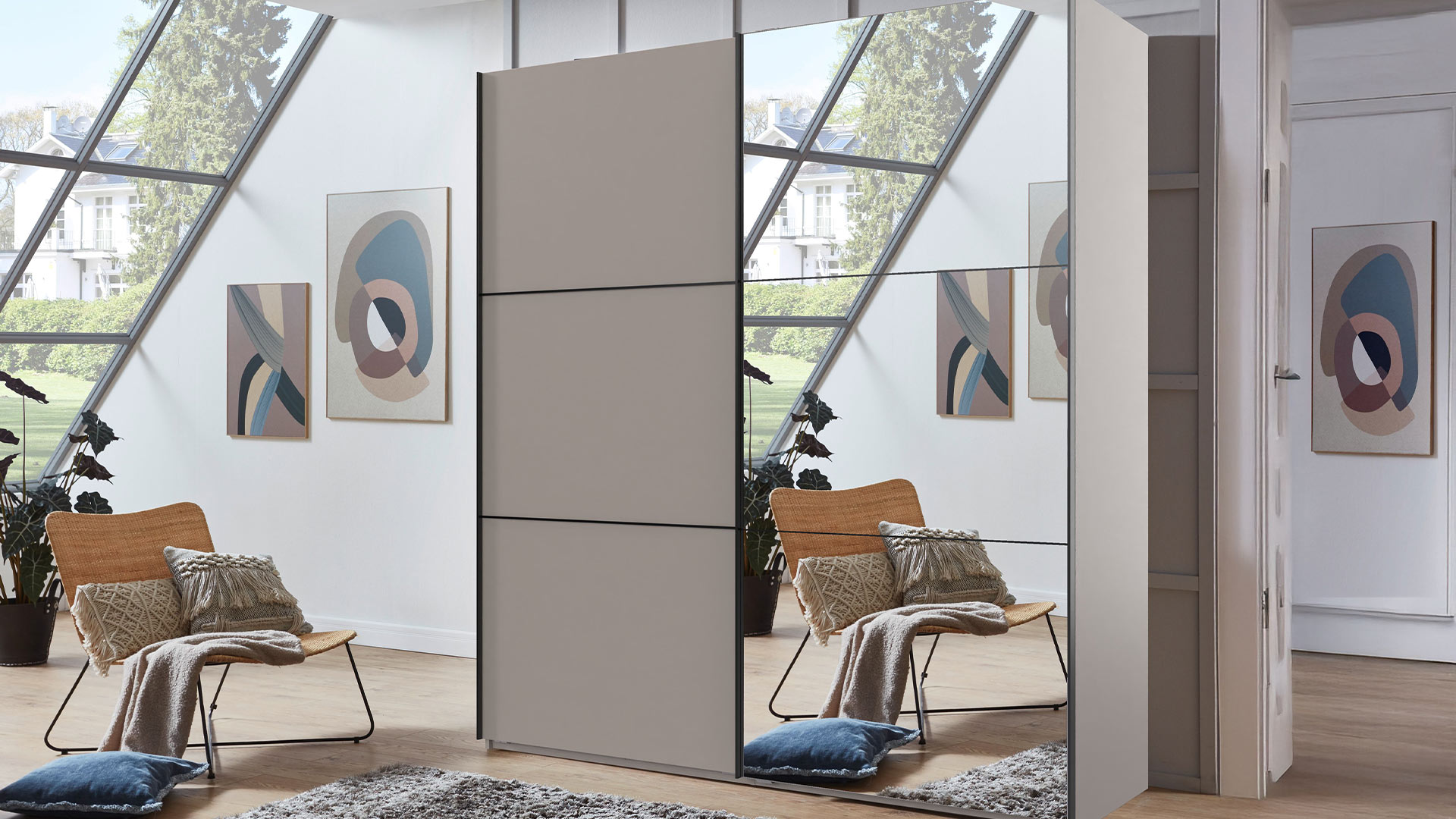 Mit 200, 250 oder 300 cm Breite schenkt dir INDIANA genau den Platz, den deine Garderobe braucht – großzügig, übersichtlich und perfekt organisiert. Komfortable Schwebetüren, uni oder mit Glas in modernen Farben, sorgen für Ruhe und Übersicht. Modelle mit Spiegeltür holen dich direkt ins Geschehen – ein kurzer Blick, ein Moment nur für dich. Schon bist du bereit für den Tag.