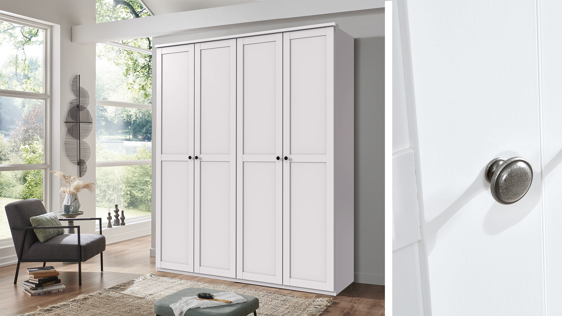 Drehtürenschränke in vier und Schwebetürenschränke in zwei Breiten bringen Struktur in deinen Alltag. Mit oder ohne Spiegel setzen die charakteristischen Rahmentüren auf klassische Eleganz mit modernem Touch. Klare Fronten, dezente Metallknöpfe und eine ruhige Formensprache machen CHALET langlebig und wandelbar. Perfekt, um es mit Textilien, Farben und persönlichen Lieblingsstücken immer wieder neu zu interpretieren.