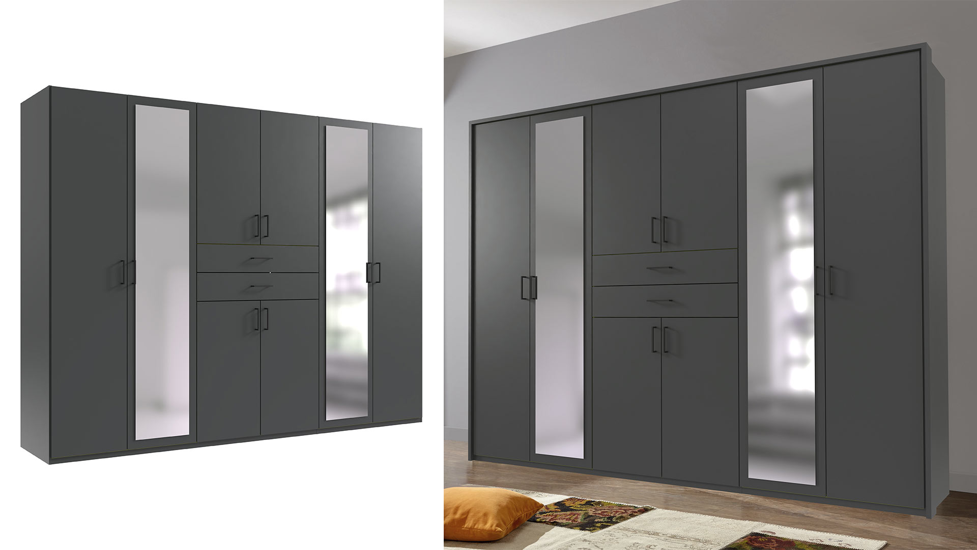 Links und rechts rahmen Spiegeltüren die Schubkästen ein. Sie geben Orientierung, holen den Fokus zurück auf dich, immer bereit für den letzten prüfenden Blick. Kurz checken, weitergehen. Der Schrank stärkt dir den Rücken, die Kontrolle bleibt bei dir.